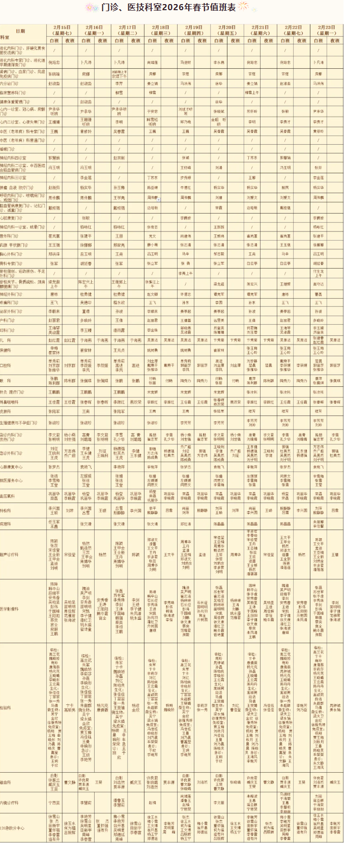 索引号 11370100004189058A-WY/2026-00011 发文日期 2026-02-13 发文单位 市五院门诊、医技科室2026年春节值班表 发布日期:2026-02-13 08:06 信息来源:济南市第五人民医院 字体:【 默认 大 超大 】 门诊、医技科室2026年春节值班表 【打印本页】 【关闭窗口】