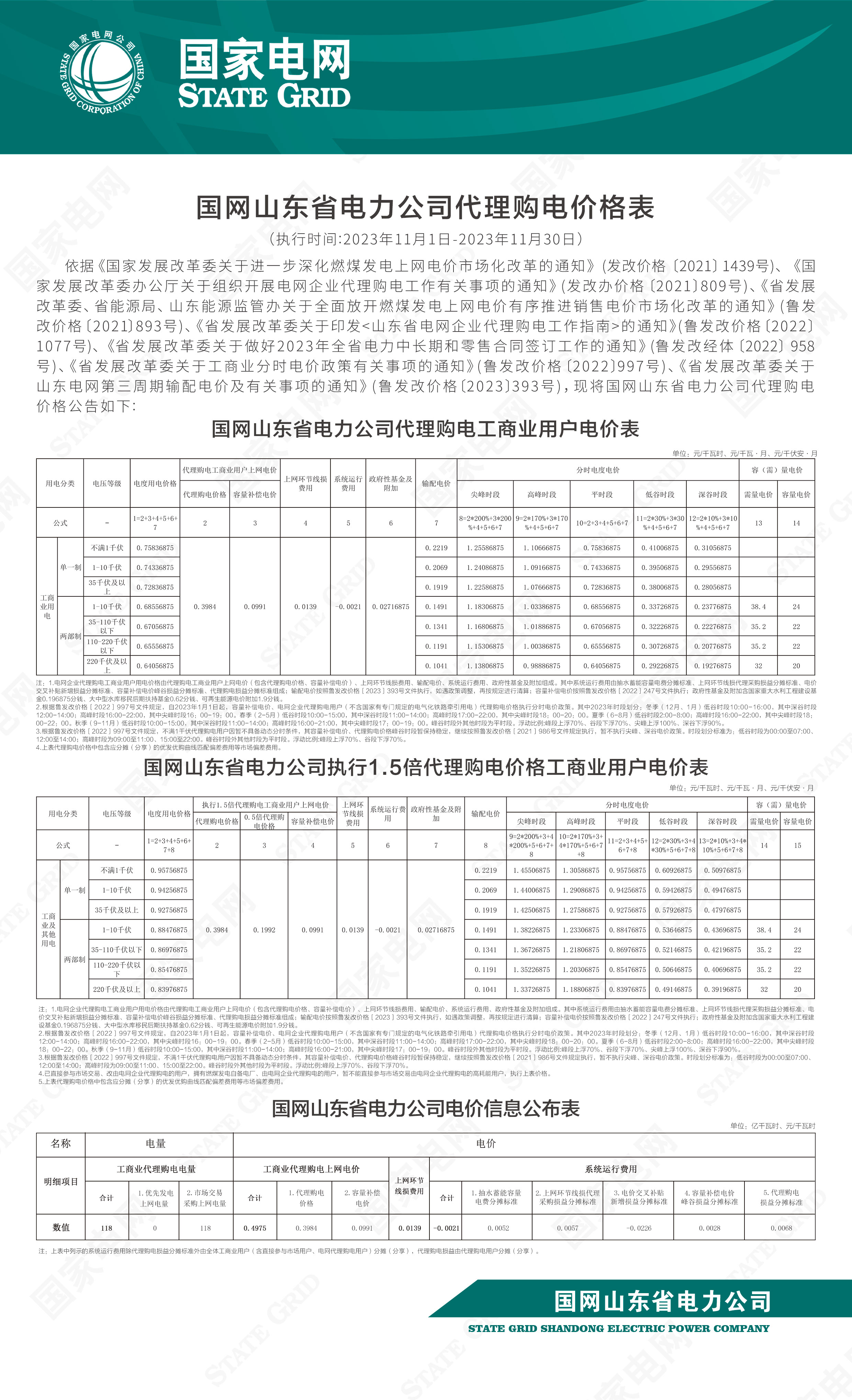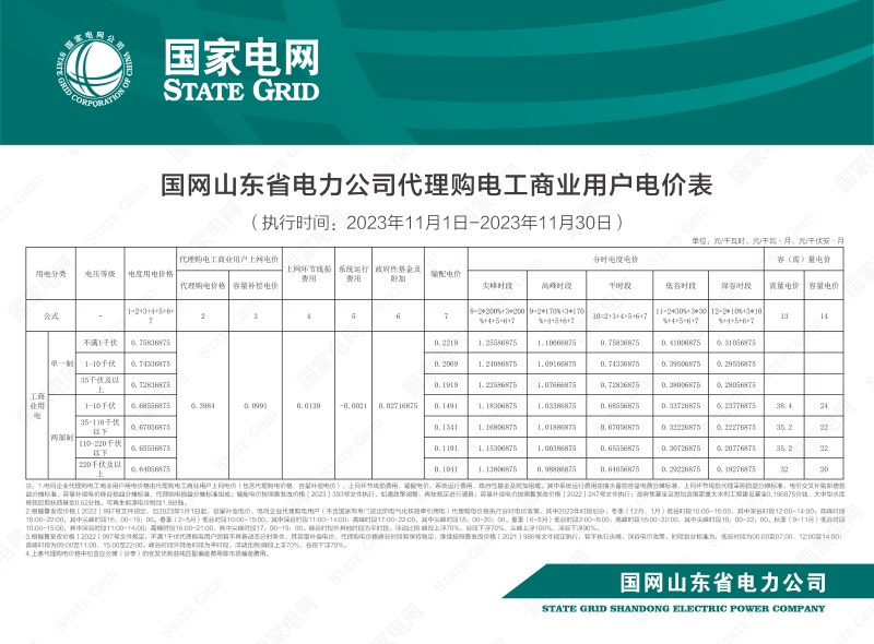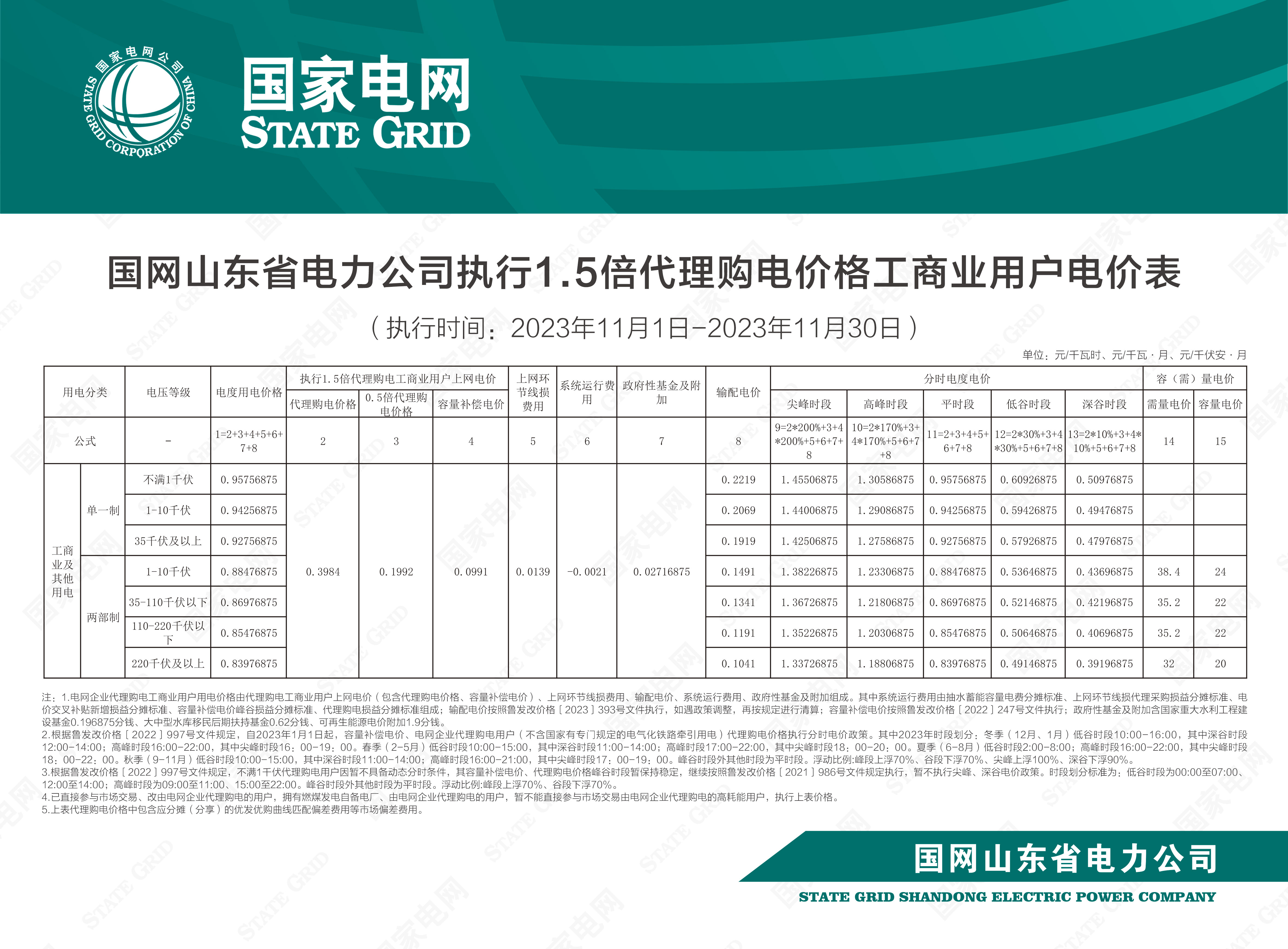 索引号 91370100MA93P7BP6R/2023-09477 发文日期 2023-11-01 发文单位 济南供电公司 供电企业向各类用户计收电费执行的政策文件-国网山东省电力公司代理购电价格表(2023年11月1日-2023年11月30日) 发布日期:2023-11-01 16:16 信息来源:济南供电公司 字体:【 默认 大 超大 】 【打印本页】 【关闭窗口】
