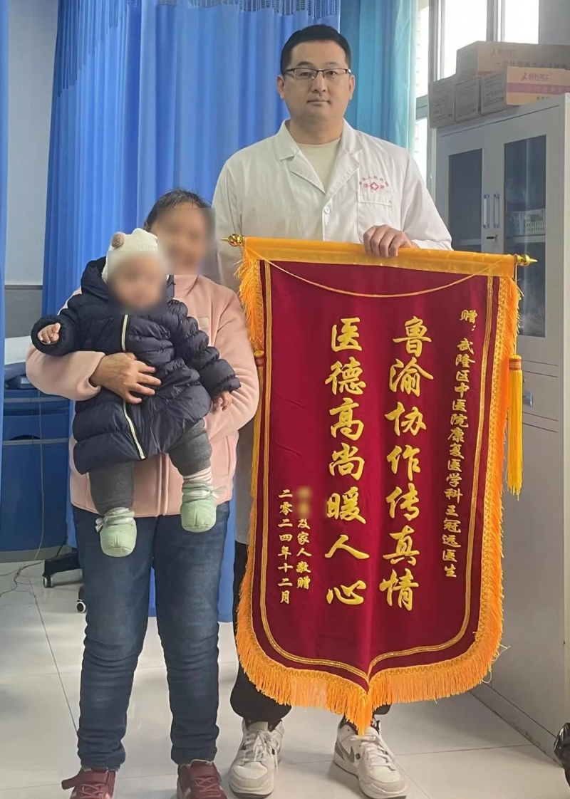 2024年12月13日,武隆区中医院康复医学科迎来了一幕温馨而感人的场景。一位怀抱9个多月大患儿的家属,手持一面鲜艳的锦旗,专程前来向在此坐诊的市五院王冠远医生表达深深的感激之情。