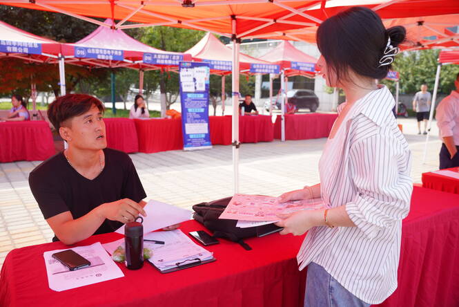 双选会现场设有简历诊断区、当兵入伍、就业创业政策咨询等功能区域。学生携带求职简历到场参会、投递,并积极了解最新大学生就业创业、征兵政策、济南市服务人才政策等。