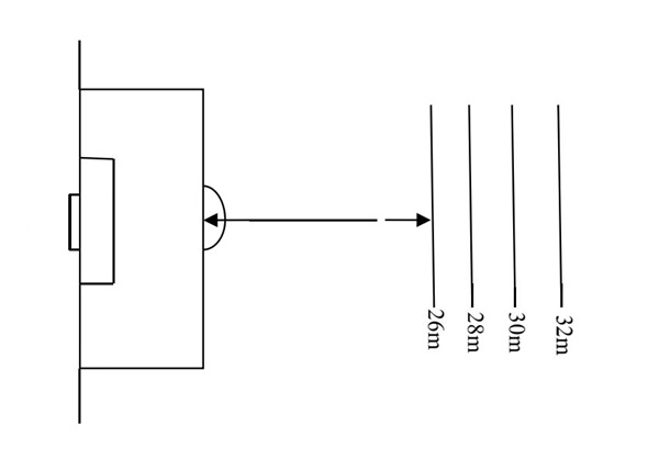 守门员在本场罚球区内,用单手(左、右手不限)将球抛向场内。抛入32米线外区域为5分;抛入30米线至32米线区域内为4分;抛入28米线至30米线区域内为3分;抛入26米线至28米线区域内为2分,共抛4次,4次成绩累加,满分为20分,手抛球时脚不得踏线或者踏过线,否则该次成绩无效(以上各线属于相邻分值高分值区域)。下图: