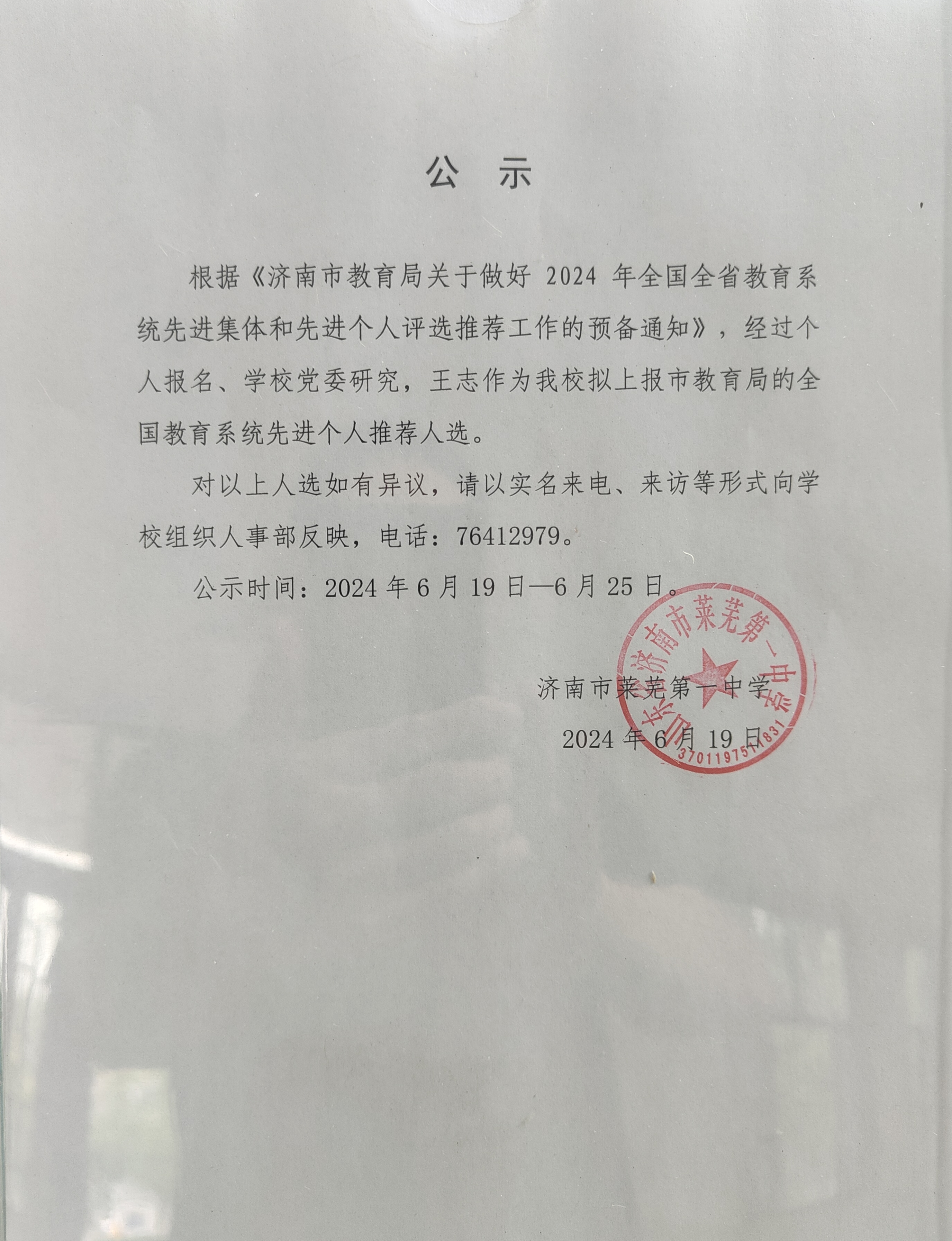 索引号 12371200494381017W/2024-04619 发文日期 2024-06-19 发文单位 济南市莱芜第一中学 济南市莱芜第一中学全国教育系统先进个人推荐人选公示 发布日期:2024-06-19 08:15 信息来源:济南市莱芜第一中学 字体:【 默认 大 超大 】 【打印本页】 【关闭窗口】